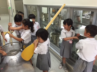 「たったの8人で850人以上もの給食を作られるなんてすごい!」「4時間もかけて作るって大変やなあ。」「お鍋もしゃもじも泡だて器もざるも、めっちゃ大きい!」など、たくさんの感想を話し合いました。