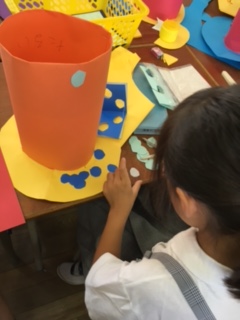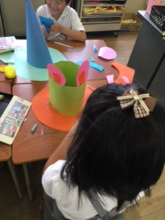 画用紙を頭の大きさに合わせて、シルクハットや三角帽子などの形ができあがりました。