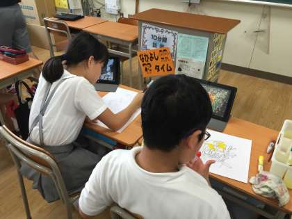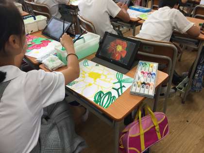学校に咲いている花をタブレットパソコンで撮影し、その画像を見ながら絵を描いています。