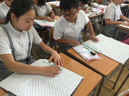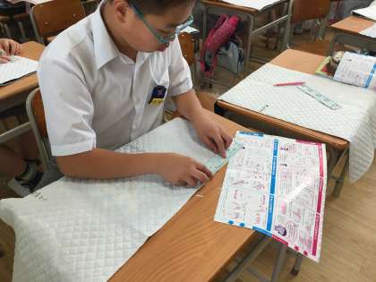 ナップサックを作ります。今日は縫い目をチャコールペンシルを使って書いていきました。次からはミシンで縫っていきます。