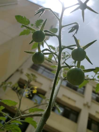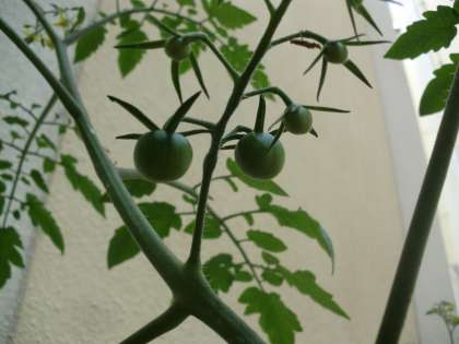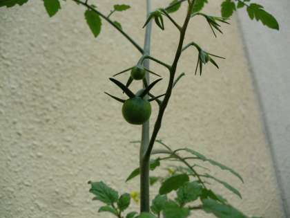 ミニトマトの実がなりました。これから太陽の光を浴びてはやく赤くなってほしいものです。