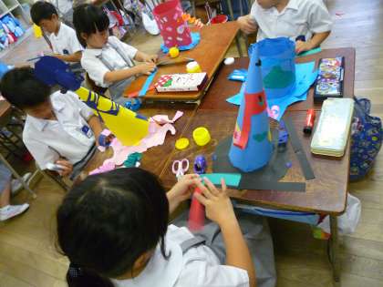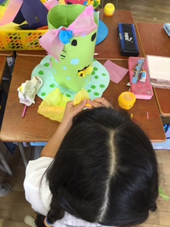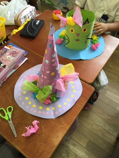 色画用紙・折り紙・お花紙を折ったり切ったり丸めたりしながら飾りをつけて、個性豊かですてきなぼうしができました。