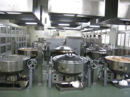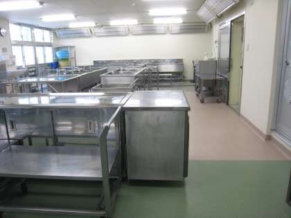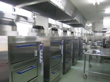◎広さ:2教室分⇒3教室分  ◎釜:5台⇒6台(うち2台は、揚げ物ができる温度調節機能付き)【1枚目の写真】 ◎3段式立体炊飯器:3台⇒5台【3枚目の写真】 ◎焼き物機:1台⇒2台 ◎屋外冷蔵庫:2台⇒4台 ◎牛乳保冷庫:1台⇒2台 ◎食材倉庫:常温⇒冷蔵(詳細は後日紹介)