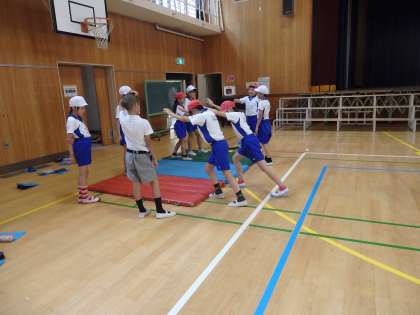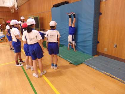 5年生は、体育科の学習でマット運動をしています。課題に合った場を選び、グループの友だちと教え合いながら、苦手な技にチャレンジしています。