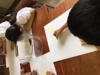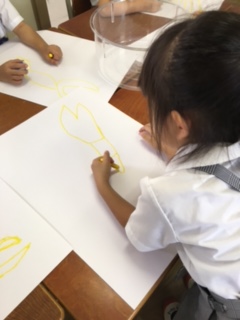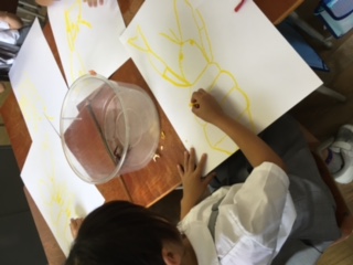 生活科で飼育しているザリガニの絵を図工科でかいています。今日は、はさみや足、触角などザリガニの特徴をよく観察して下書きをかきました。次は、色を塗っていきます。
