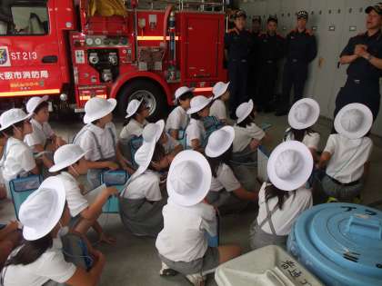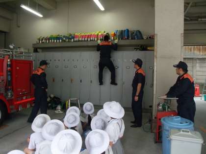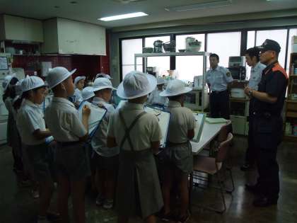 4年生は、社会の学習の一環で中央消防署の見学に行きました。消防署での仕事や消防車の仕組み、消防車に積んでいるものなどを教えていただきました。