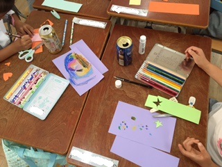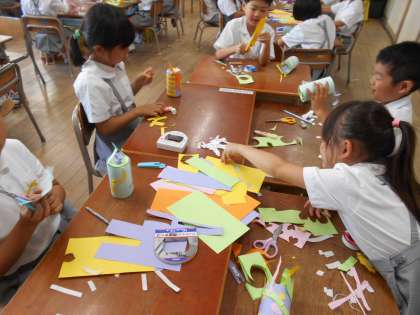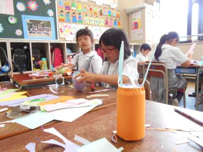 好きな絵をかいたり、模様を貼ったりした画用紙を空き缶に巻き、転がすおもちゃをつくりました。グループで仲良く紙を配り合いました。