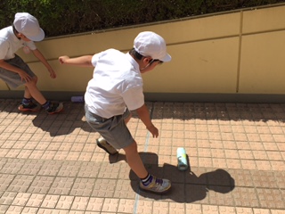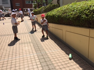 出来上がった作品は、坂道で転がしました。みんなで並んで一斉に転がしたり、脚でトンネルを作ったりして楽しみました。