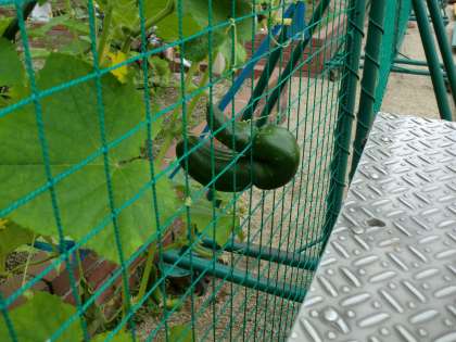 特にこのキューリは、ネットにからまってしまい、大きく曲がって育っています。