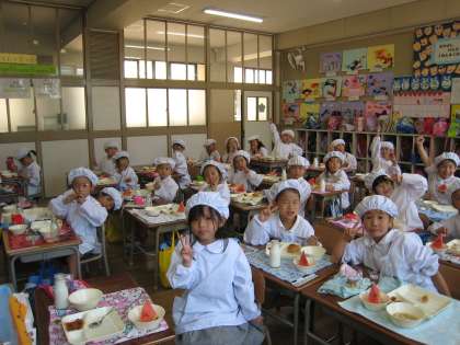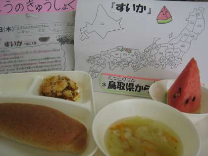 1年に1回のとっても甘くておいしいすいかに、子どもたちは笑顔いっぱいで「おいしかったので、白い所まで食べてしまった」と自慢げに報告してくれる児童もいました。今日は、すいかで盛り上がった給食時間でした。