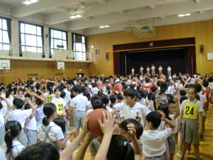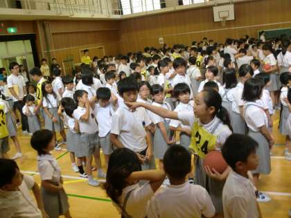 集会委員会の企画で、ボール回しゲームを行いました。班でボールを頭の上から回したり下から回したりしながらみんなで協力して活動することができました。