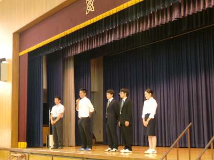 今日は児童朝会で子どもたちの前で紹介しました。中央小学校の卒業生もいます。
