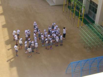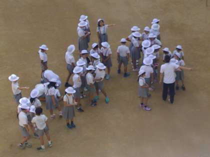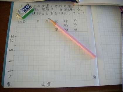 金曜日の月の観察にそなえて、ノートに方位と高さを書きこみ、高さのはかり方を練習しました。目の高さに0度の手を合わせて下がらないように高さをはかります。