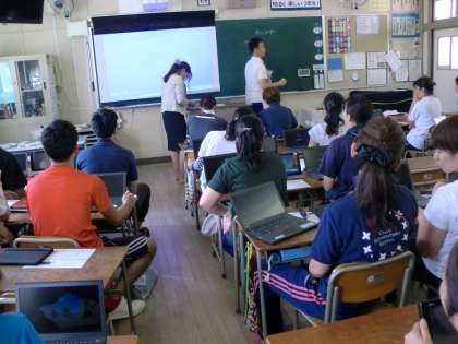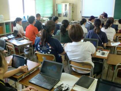 校内で授業用ノートパソコン、タブレットの操作方法について研修会を行いました。新たな機能に驚きの声もあがりました。一日も早く使いこなせるように教職員も学習していきます。