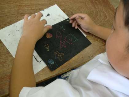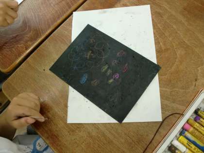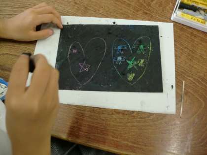 パスで色を塗り、最後に黒を塗り重ねたものを今日は爪楊枝で削り、絵を描きました。