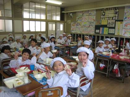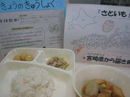十五夜を「いも名月」と言うことやさといもをお供えする風習が日本各地にあることにちなみ、さといもを使った煮もの(使用したさといもは、なんと500個!)と月見だんごに見立てた「みたらしだんご」が登場しました。「みたらしだんご」は子どもたちに人気の和風デザートであり、ニコニコ笑顔いっぱいの給食時間となりました。