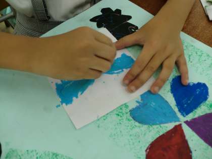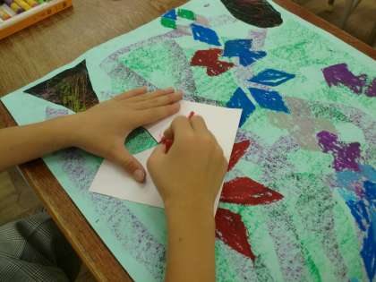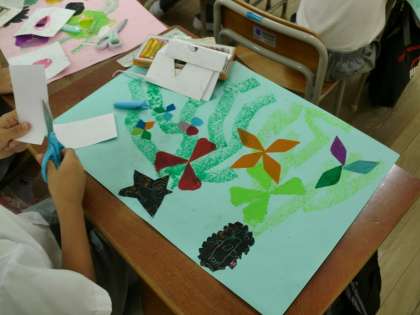 画用紙を切り抜き、型紙を作って色を塗っています。
