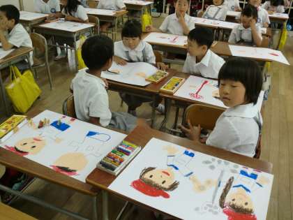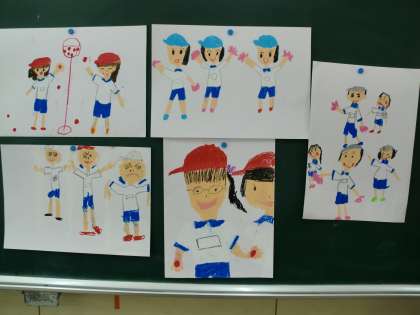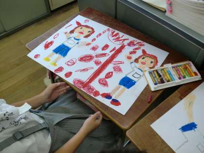 運動会のことを思い出して絵を描いています。印象に残ったことは様々で、どんな場面を描いたのか話しながら描いていきました。