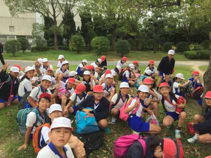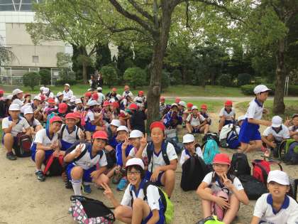 六年生と一緒に班をまとめる頼もしい五年生です。五年生も到着しました。