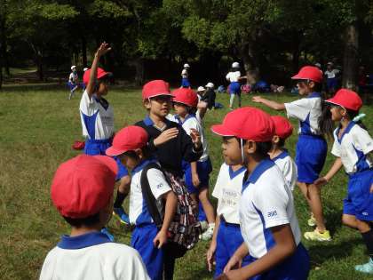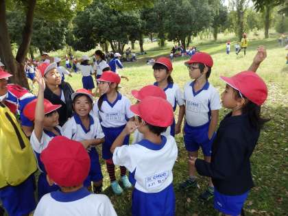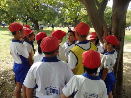大きな声で「みんな、こっちに集まって〜!」と呼びかけます。今日のために、何回も練習したルール説明は、みんなしっかり聞いてくれていました。そして、「おにしたい人!」と5年生が聞くと、たくさんの子が手を挙げていました。さあ、いよいよ楽しい班遊びのスタートです!