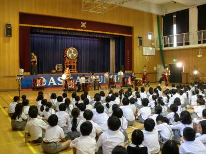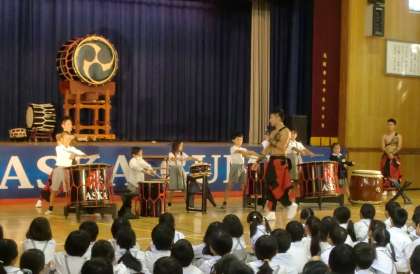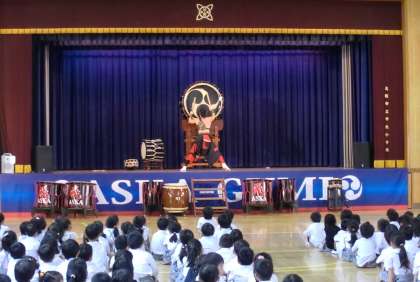 また舞台上に置かれた太鼓は直径が2m近くあり、大きな音が講堂に響きわたりました。
