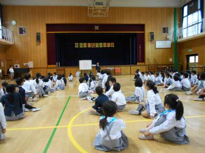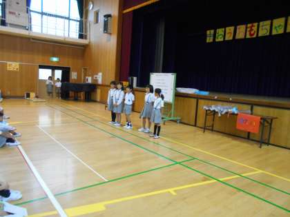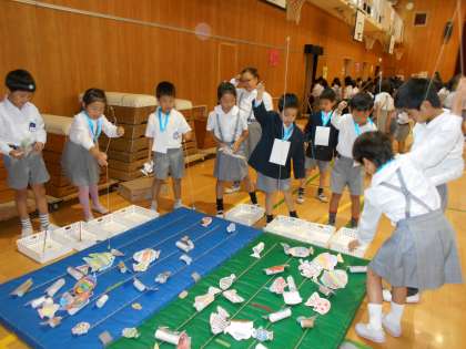 2年の生活科でおもちゃを作り、作ったおもちゃを講堂に集めて1年生を招待して「中おうおもちゃランド」をしました。2年生と1年生がペアになり楽しく遊びました。