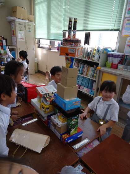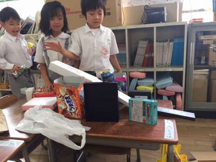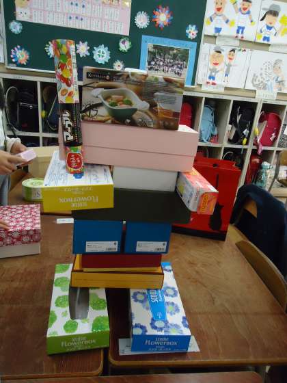 箱や缶を使って、いろんなものをつくりました。