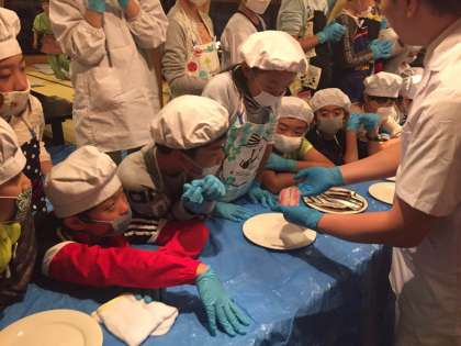もう一方では、イワシ手さばき体験を行なっています。