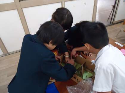 みんなで協力して、どんぐり迷路も作りました。できたおもちゃは、みんなで遊びました。