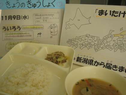 今日のメニューは「豚肉とまいたけのいためもの、つみれ汁、ういろう(全て年1回)、ごはん、牛乳」でした。