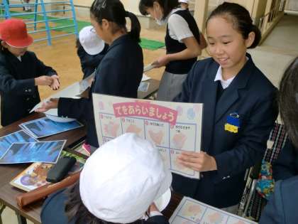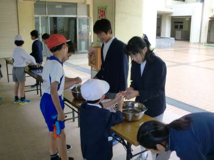 健康委員会の子どもたちが、正しい手洗いの方法を教えています。