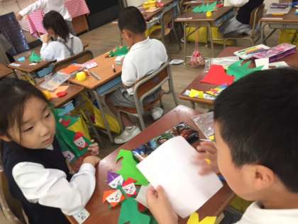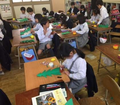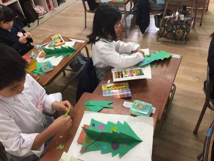 クリスマスツリーにいろいろな飾りを描いています。サンタさんから何のプレゼントをもらうか、みんなワクワクしています(^_^)