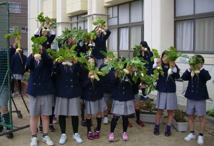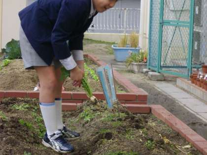 みんなで育てていた天王寺かぶらと田辺大根を収穫しました。