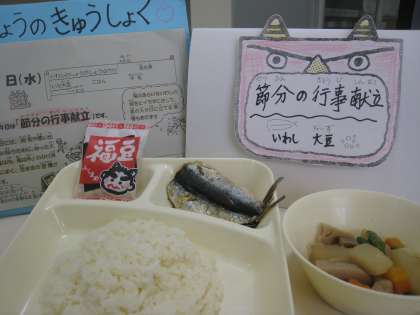 明日は節分!給食では一足早く節分の行事献立「いわしのしょうがじょうゆかけ(年1回)、含め煮、いり大豆、ごはん、牛乳」が昨日あり、鬼さんから手渡しをしていただきました。