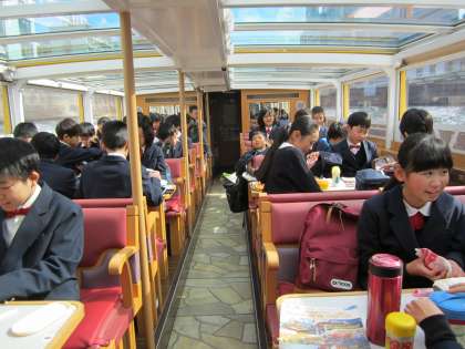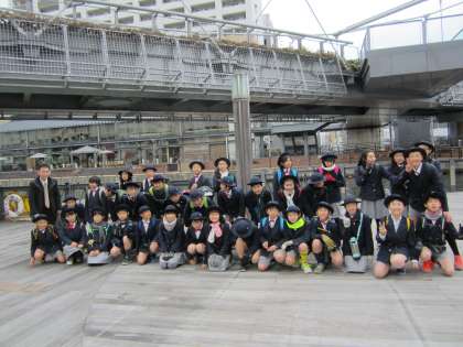 6年生が小学校生活最後の校外活動である社会見学「なにわ探検クルーズ」に出かけました。クルーズ船は貸切ですが1クラスしか乗船できないので3日間に分かれての実施で初日は6年1組でした。今日は節分にしては、暖かく天候に恵まれました。地域学習の総まとめとして、落語家の楽しい案内で水の都・大阪の街を川から探検しました。水門やたくさんの橋を通過しドーム、中之島の公会堂・市役所、大阪城、造幣局など様々な建物を見ることができました。お弁当を食べたり、落語家さんから落語のお話や所作を教えてもらったり、楽しい思い出に残るクルーズになりました。
