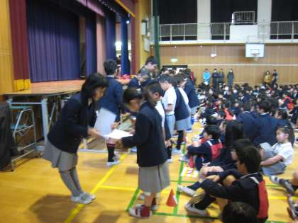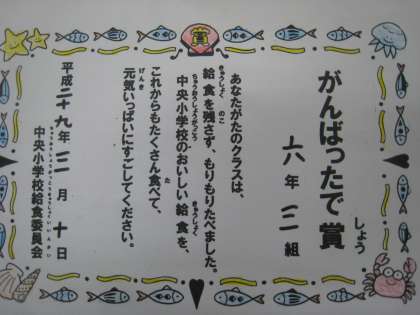 今日の児童集会で、給食委員会から3学期の『今日も残さず食べるデー』の表彰を行いました!
