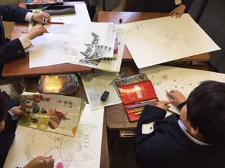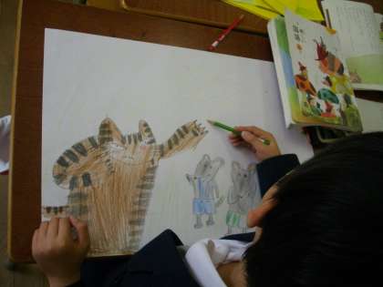 「ニャーゴ」の紙芝居を、グループで協力して作りました。絵と文章をかいてから、紙芝居になるように考えながら裏に文章を貼り、読む練習をして発表をしました。どのグループもとても上手に出来ました。