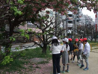 さっそく春の生き物を観察しに、4年1組、2組が高津公園に行きました。