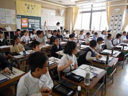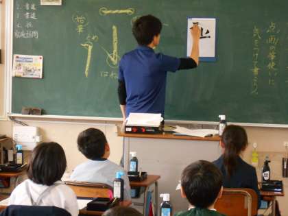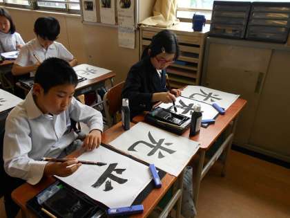 4年生になって初めての書写(毛筆)で、「光」という字を書きました。『しせいや筆の持ち方、点画の筆使いに気をつけて書こう。』をめあてに、学習しました。
