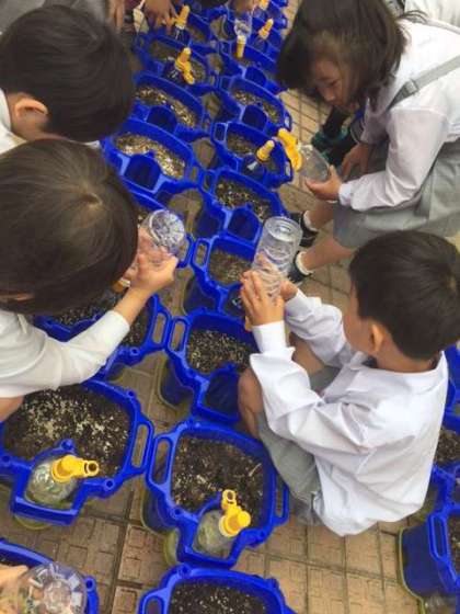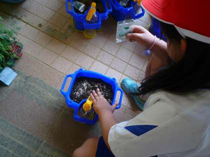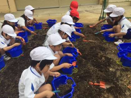 生活科の時間に、あさがおのたねまきをしました。最初にたねの色や形を観察し、かんさつカードに書きました。うえきばちに土を入れて、たねをまき、子どもたちは何色のお花が咲くか、ワクワクしながら活動していまいた。