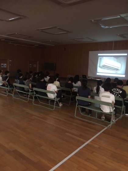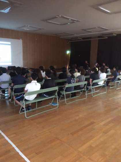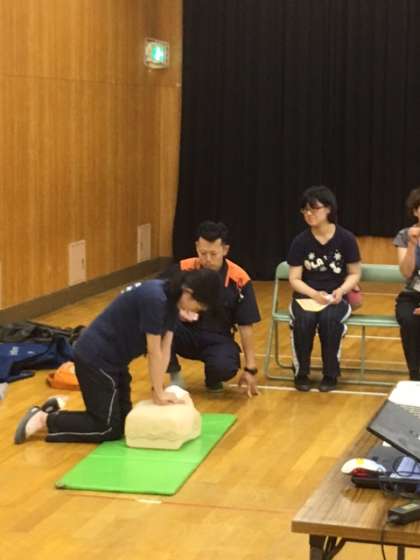 本日14時30分から多目的ホールで救命講習会を行いました。救急車が到着するまでに、心肺蘇生をする重要さについてDVDで学びました。その後、人形を使って訓練をしました。