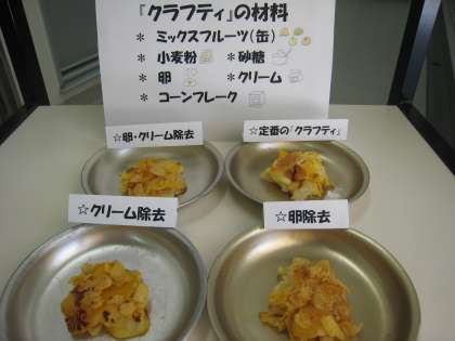 中央小では、卵や乳製品に食物アレルギーを有する児童がいます。本日の『ミックスフルーツのクラフティ』では、1 卵除去 2 クリーム除去 3 卵・クリーム除去の3種類を作りました。給食室では、定番のミックスフルーツのクラフティと3種の除去食の調理に、細心の注意を払いながら1人でも多くの児童のニコニコ笑顔をめざして、今日も安全・安心でおいしい給食作りに奮闘する調理員さんたちでした。