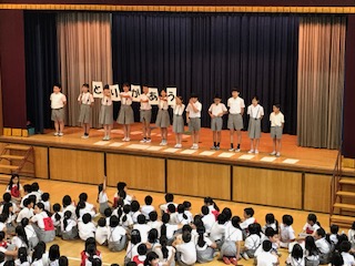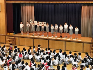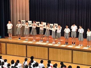 今日の児童集会は、「なかよし言葉あてゲーム」でした。
