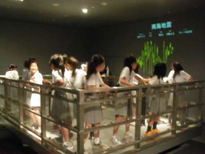 実際の地震の揺れを体験するコーナーでは、阪神・淡路大震災と、これから近いうちに起こるといわれている南海トラフ大地震の揺れを体験しました。