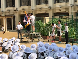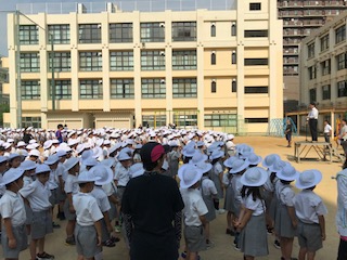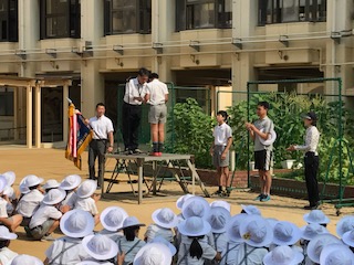 本日の児童朝会では、校長先生から、暑くなっても外で元気よく遊び、熱中症に気をつけるようにと、お話を聞きました。