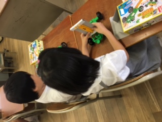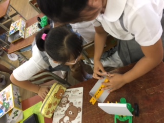 風やゴムのはたらきの学習が始まりました。今日は作った車を風の力で走らせました。車を作るときにも分からない友だちに優しく声をかける姿が見られました。子どもたちは「どうやったらもっと早く走れるかな?」「あの子のはすごく早いよ」など楽しみながら学習していました。