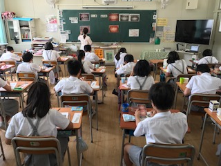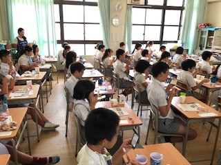 7月7日に6年生で「歯と口の健康教室」が行われました。歯科衛生士さんが、虫歯になる原因や歯周病の危険性について教えてくれました。歯の磨き方も指導してくださり、歯こうを残さない丁寧な磨き方を学ぶことができました。