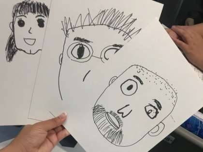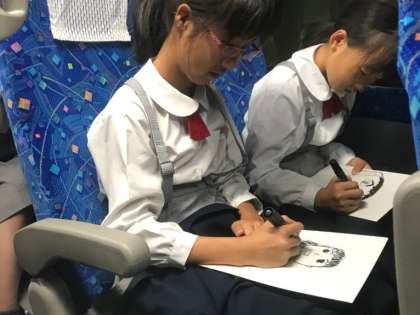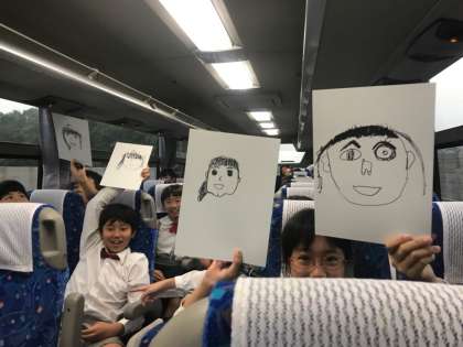 バスの中で先生の似顔絵対決!