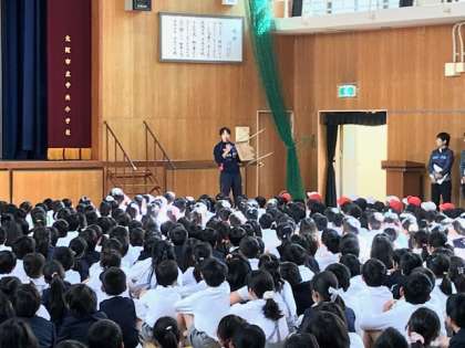 講堂では、警察署の方から、不審者に遭遇した時の対応の仕方や先生の指示を聞いて冷静に動くことなどを教わりました。また、青パトの方の紹介もありました。