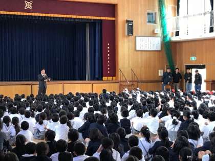 警察署の方が不審者役を演じ、教職員で協力して取り押さえる訓練や講堂に素早く避難する訓練を行いました。